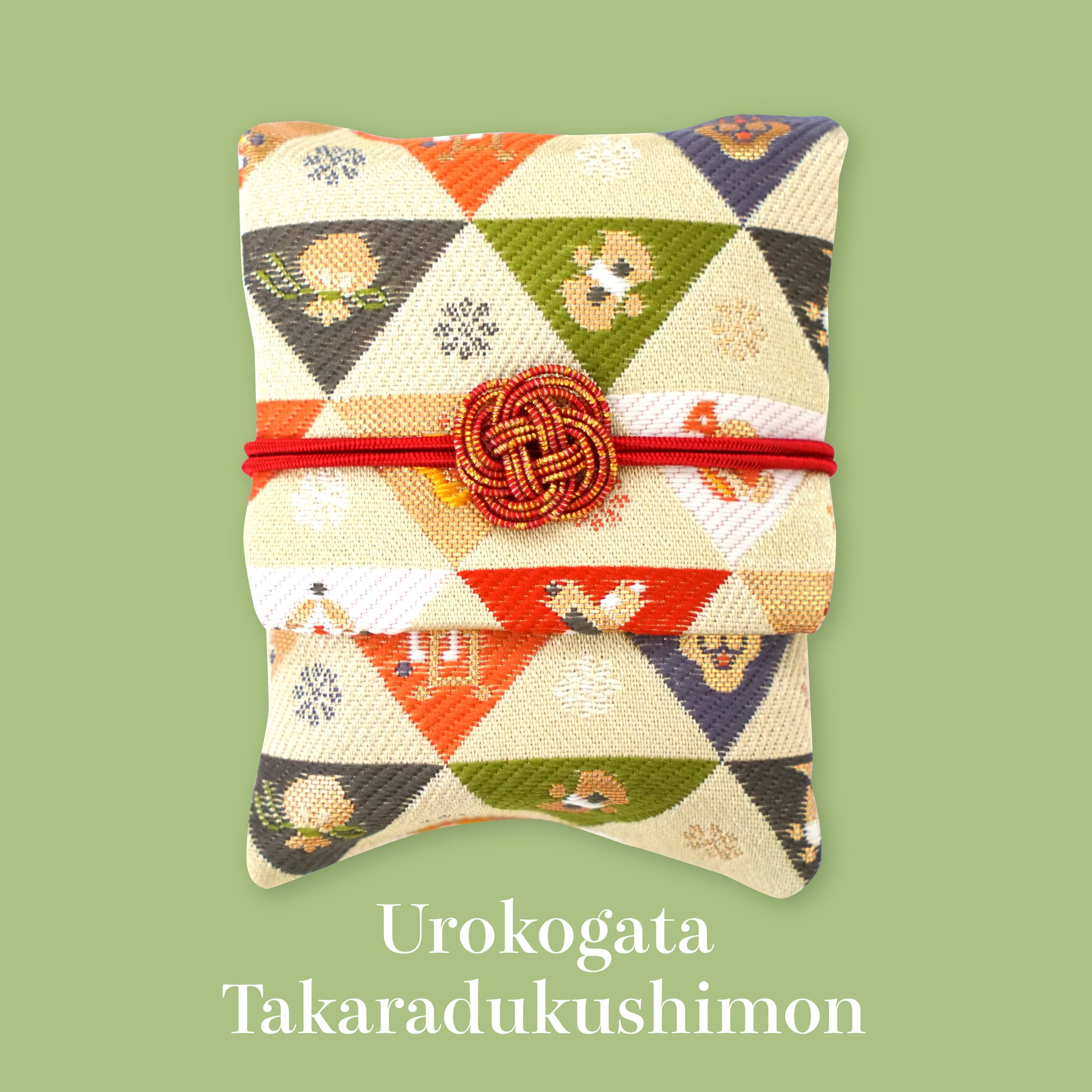 富に恵まれ、宝のありかを知らせ宝を守ってくれると崇敬されている「鱗形」の紋様の中に福を招く小槌、お守りやお金、香料などを入れる袋である金嚢、ありがたいお経などが書かれた宝巻や秘伝が書かれた巻軸などを入れる筒守など、彩り豊かに織なしたおめでたいモチーフが勢揃いした柄です。